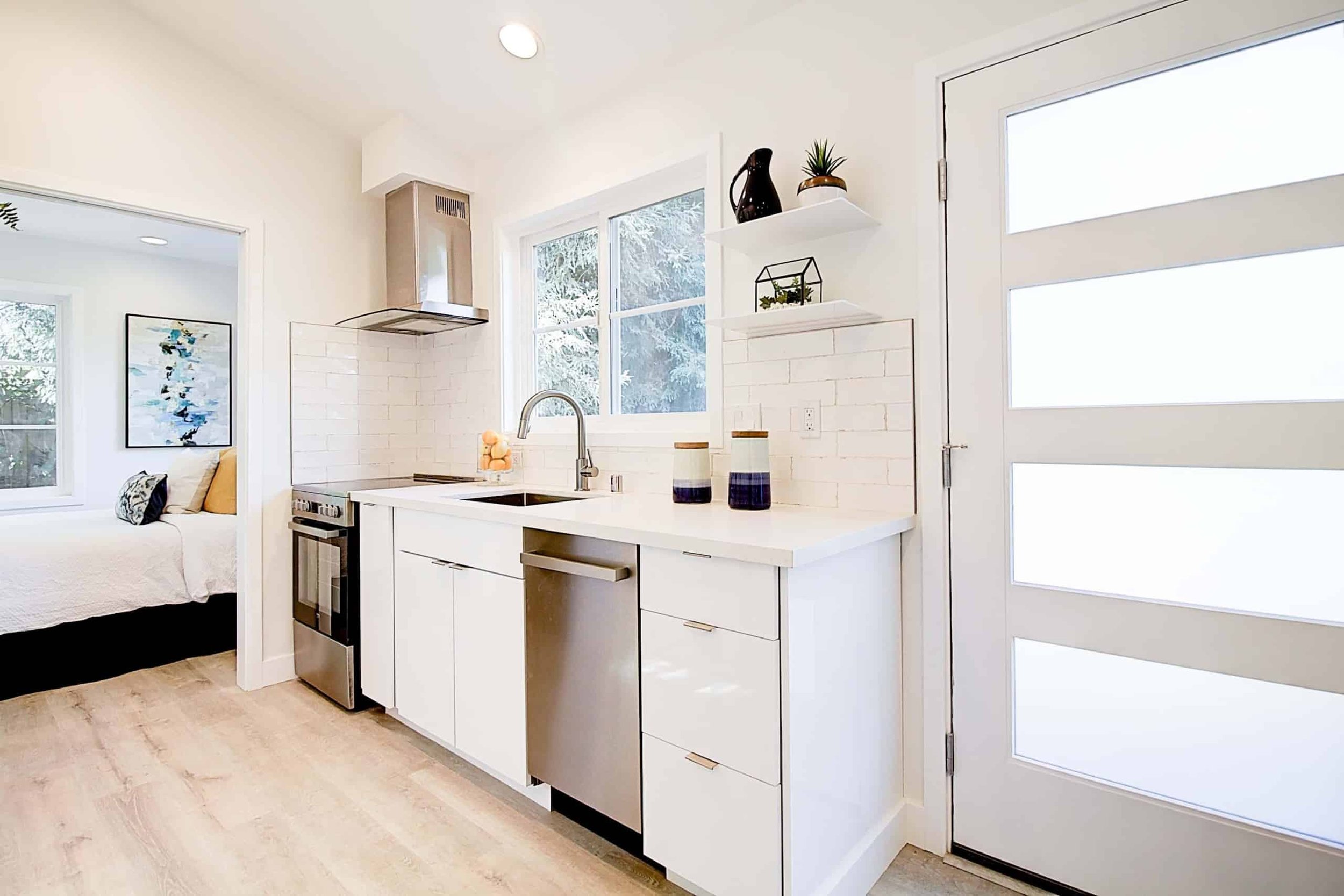Modern minimalist kitchen featuring sleek white cabinetry, stainless steel appliances, light oak flooring, and a frosted glass door that leads into a bright, separate bedroom.