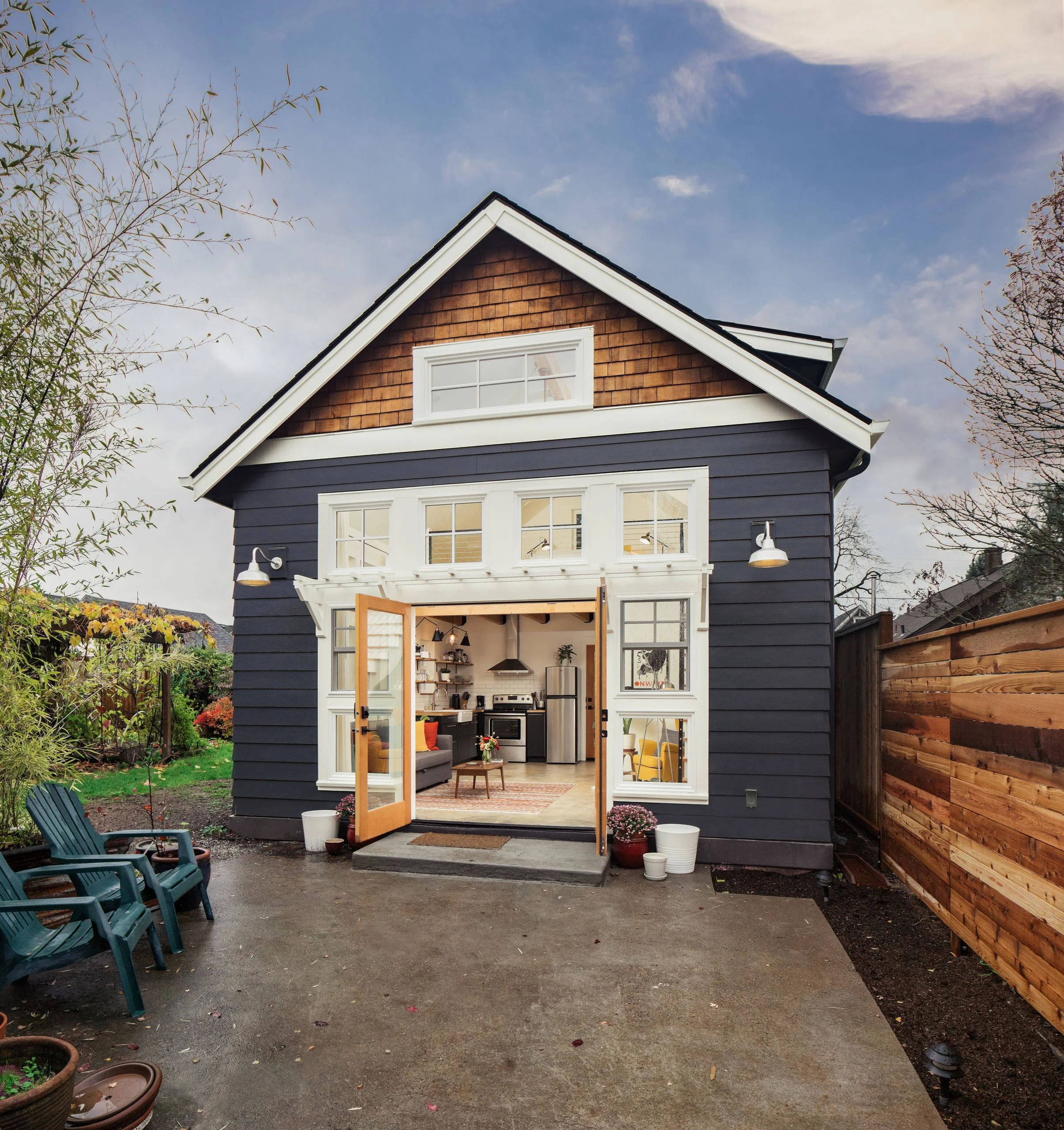 Modern Craftsman-style guest house featuring a dark navy exterior with white trim, a gabled roof with natural cedar shingles, and large double French doors that open to a concrete patio and landscaped backyard.