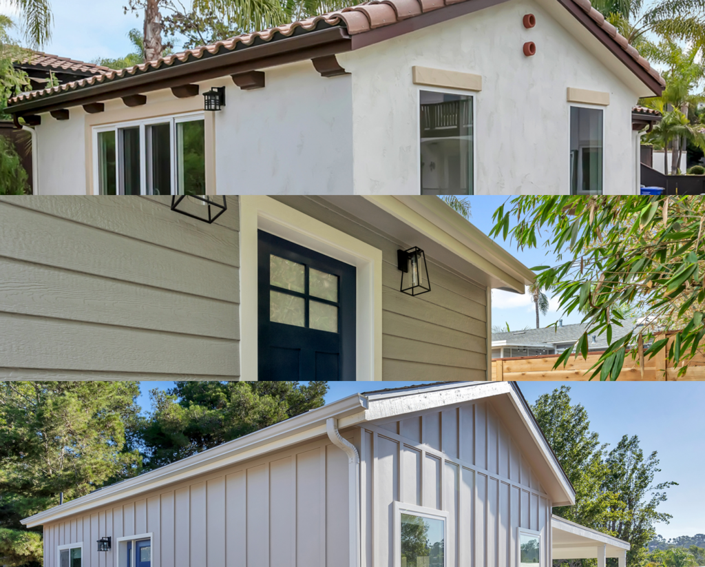Architectural collage of Accessory Dwelling Units (ADUs) featuring various exterior finishes, including Spanish-style stucco with clay tile roofs, modern horizontal siding, and classic board-and-batten siding with gabled rooflines.
