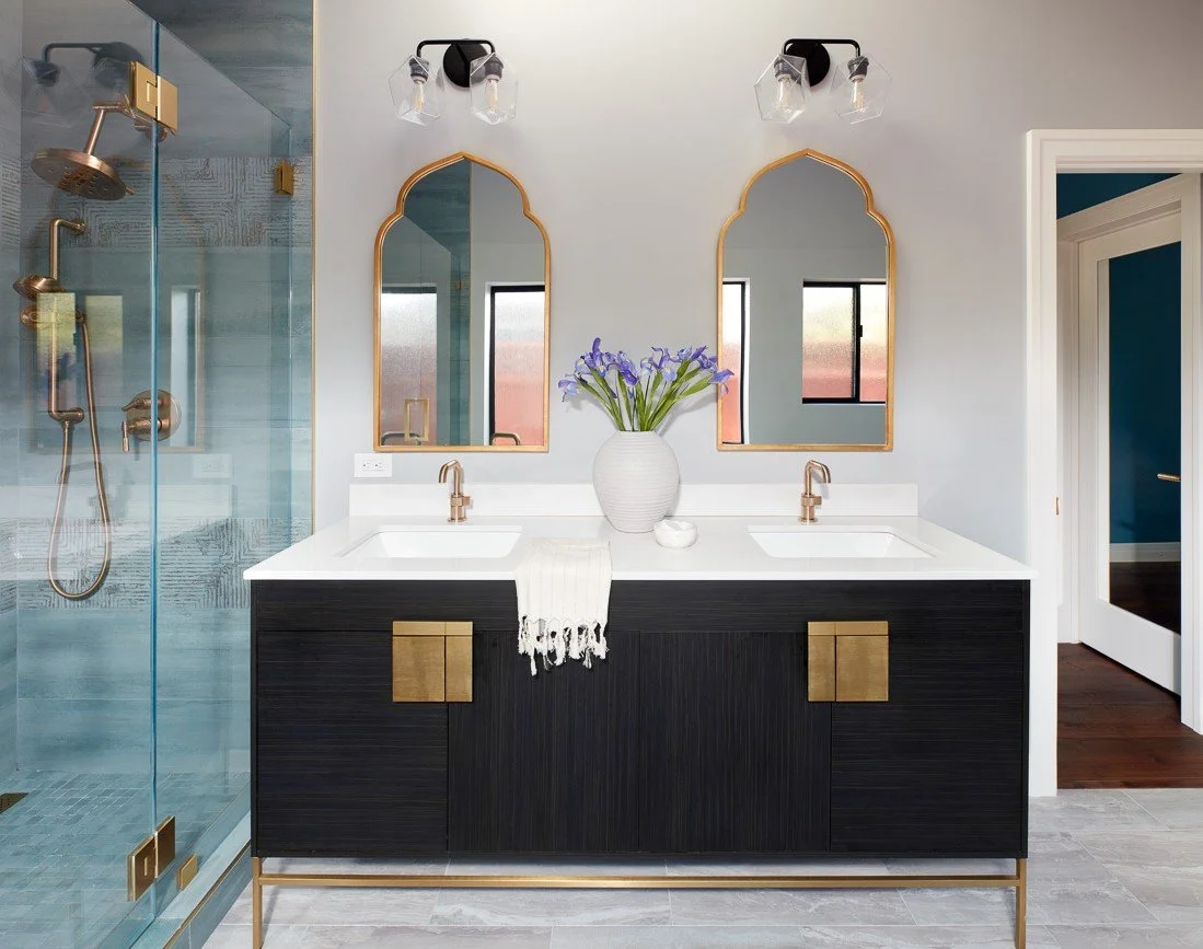 Custom home bathroom featuring a double vanity with dark wood cabinetry, brass hardware, arched mirrors, modern wall sconces, and a glass-enclosed shower with blue tile accents.