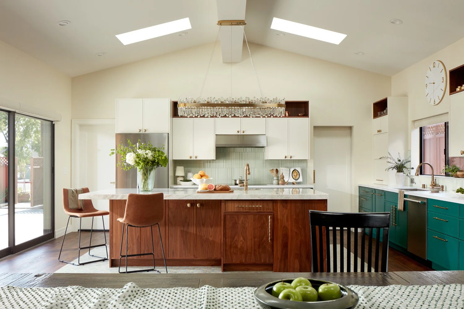 Custom home kitchen with vaulted ceilings and skylights, featuring a walnut kitchen island with waterfall countertop, white upper cabinets, green lower cabinetry, brass hardware, and a statement chandelier—highlighting a luxury custom home remodel with modern craftsmanship and natural light.