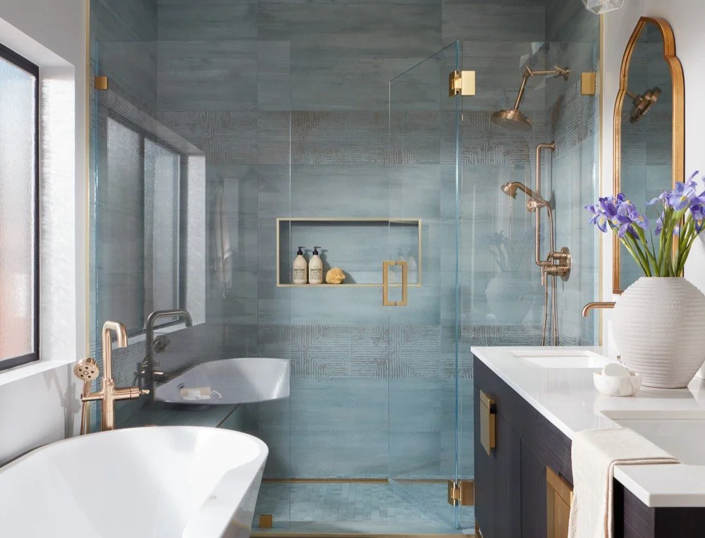 Custom home bathroom featuring a freestanding soaking tub, glass-enclosed walk-in shower with blue tile walls, brass fixtures, and a modern double vanity with white countertop.