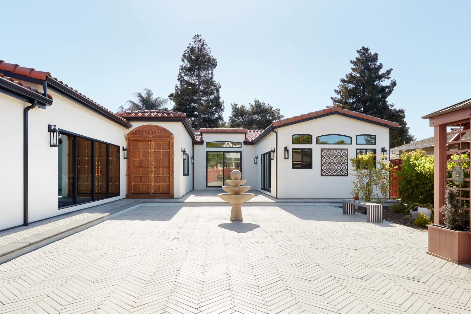 Custom home exterior featuring a Spanish-inspired courtyard with white stucco walls, clay tile roofs, black-framed windows, a central stone fountain, and herringbone paver patio, showcasing a luxury custom home build with indoor–outdoor living.