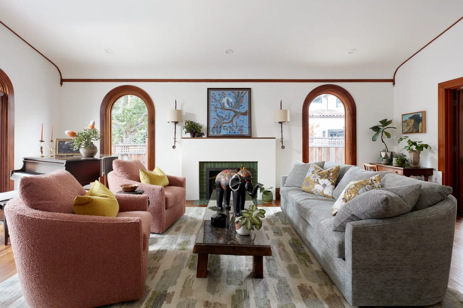 Custom home living room remodel featuring arched windows, a central fireplace, curated furnishings, and warm wood trim details.