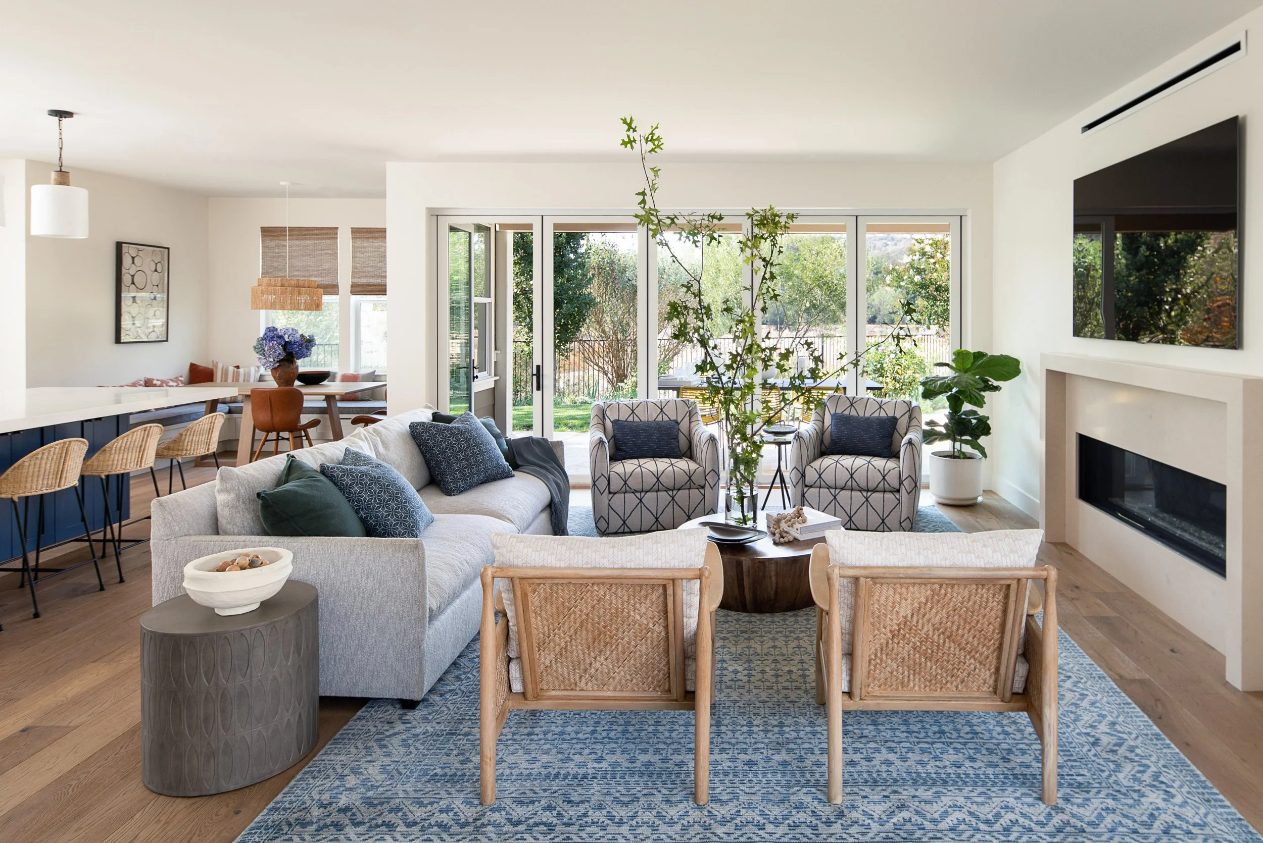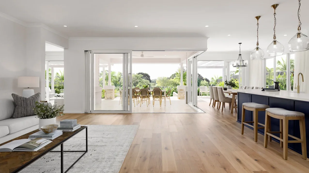 Open-concept home remodel featuring seamless wide-plank wood flooring, a bright living area flowing into a modern kitchen with a blue island, large sliding glass doors opening to an outdoor dining patio, and abundant natural light connecting indoor and outdoor spaces.