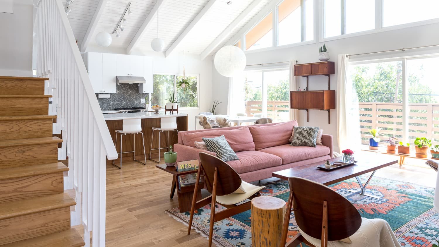 Open-concept home remodel with a light-filled living room flowing into a modern kitchen and dining area, featuring wide-plank wood flooring, sliding glass doors to the backyard, cohesive finishes, and seamless indoor–outdoor connection.