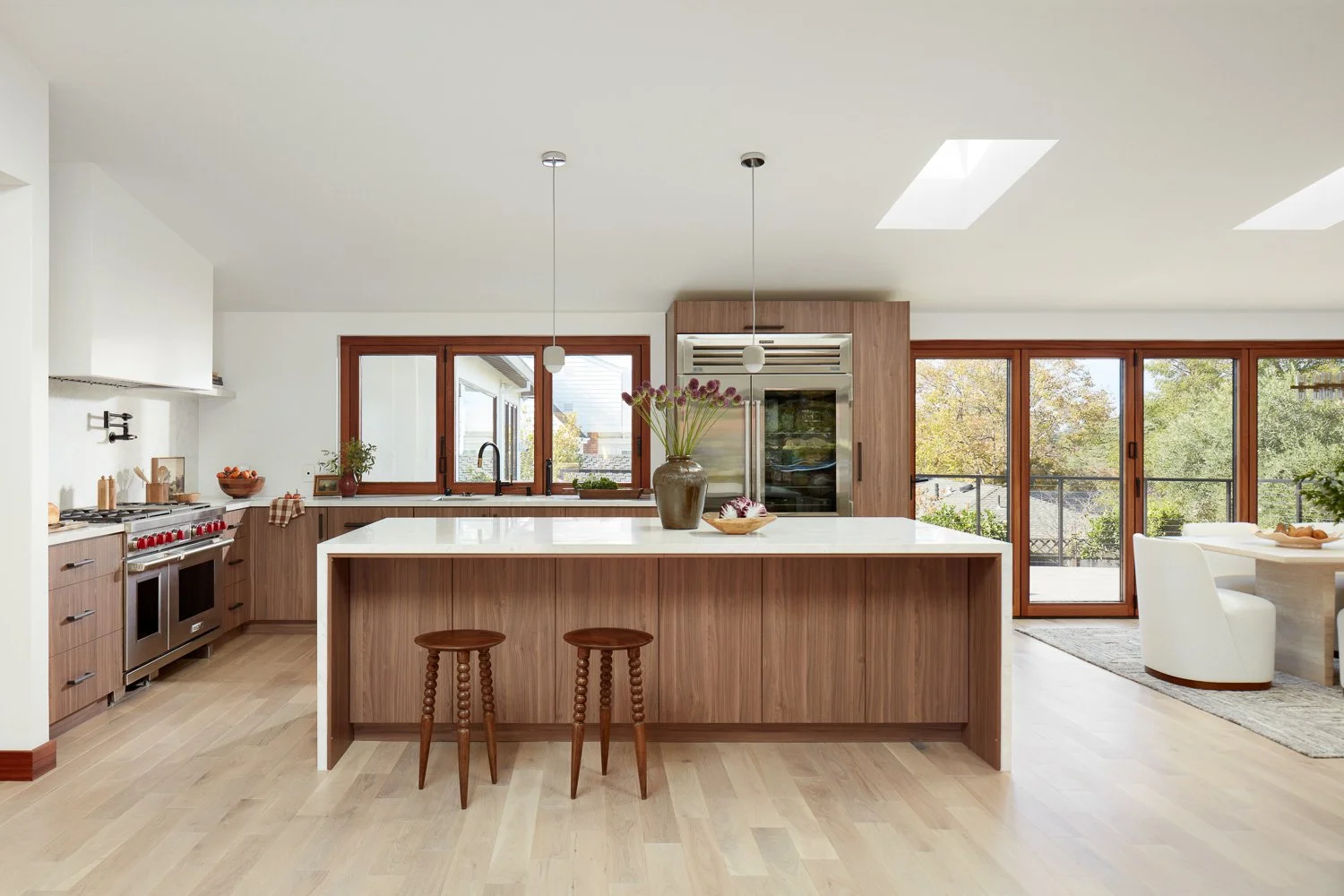 Open-concept kitchen in a whole house remodel with walnut cabinetry, oversized island, white countertops, skylights, and large sliding glass doors.