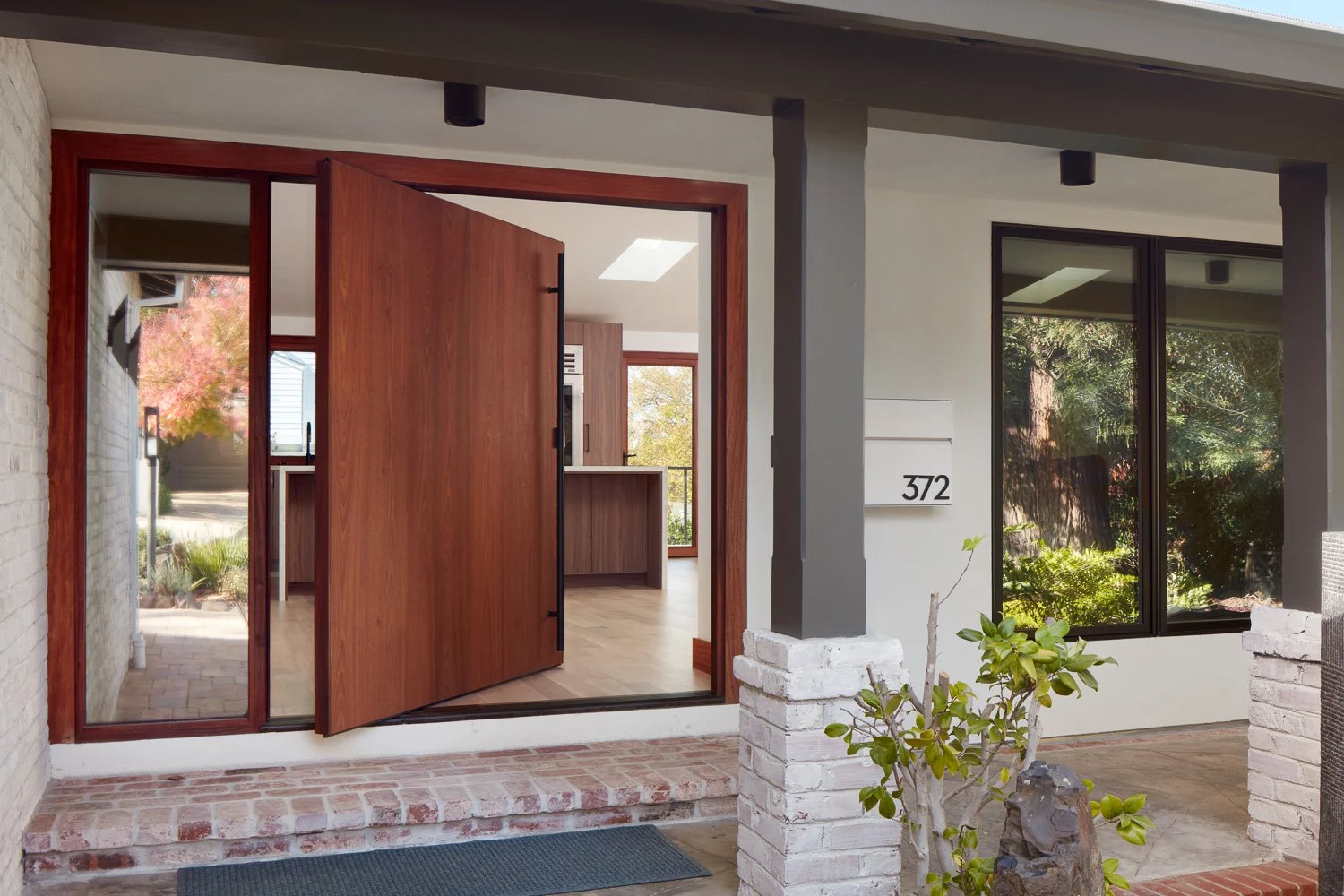 Custom home front entry with modern wood pivot door, clean architectural lines, brick detailing, and contemporary exterior finishes.
