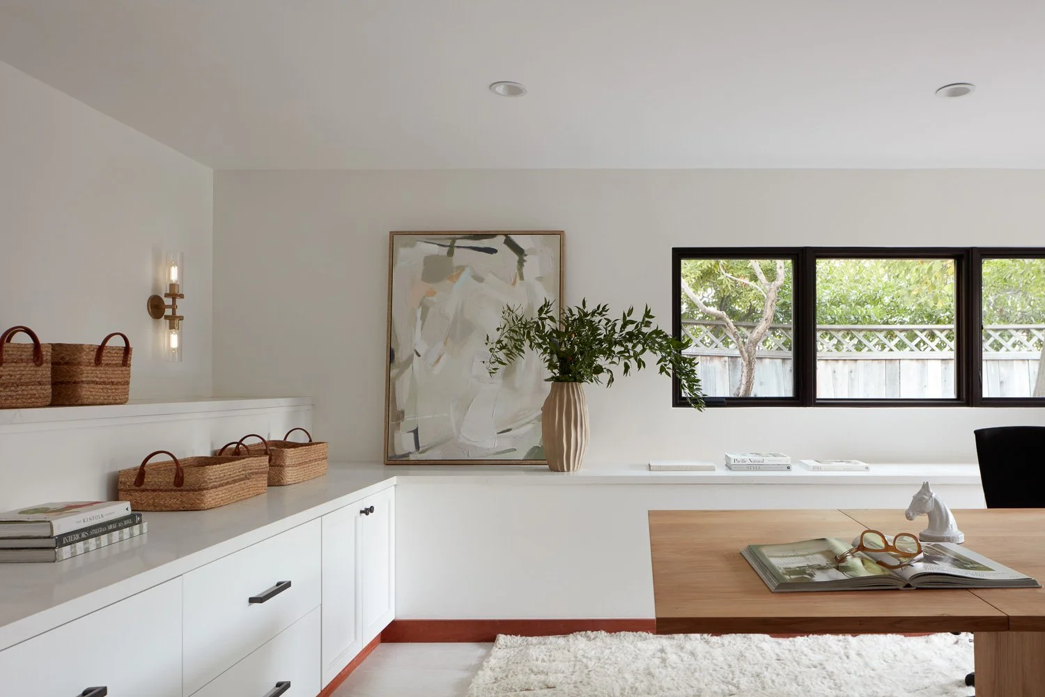 Modern custom home office with built-in white cabinetry, minimalist decor, wood desk, and black-framed windows overlooking a landscaped yard.
