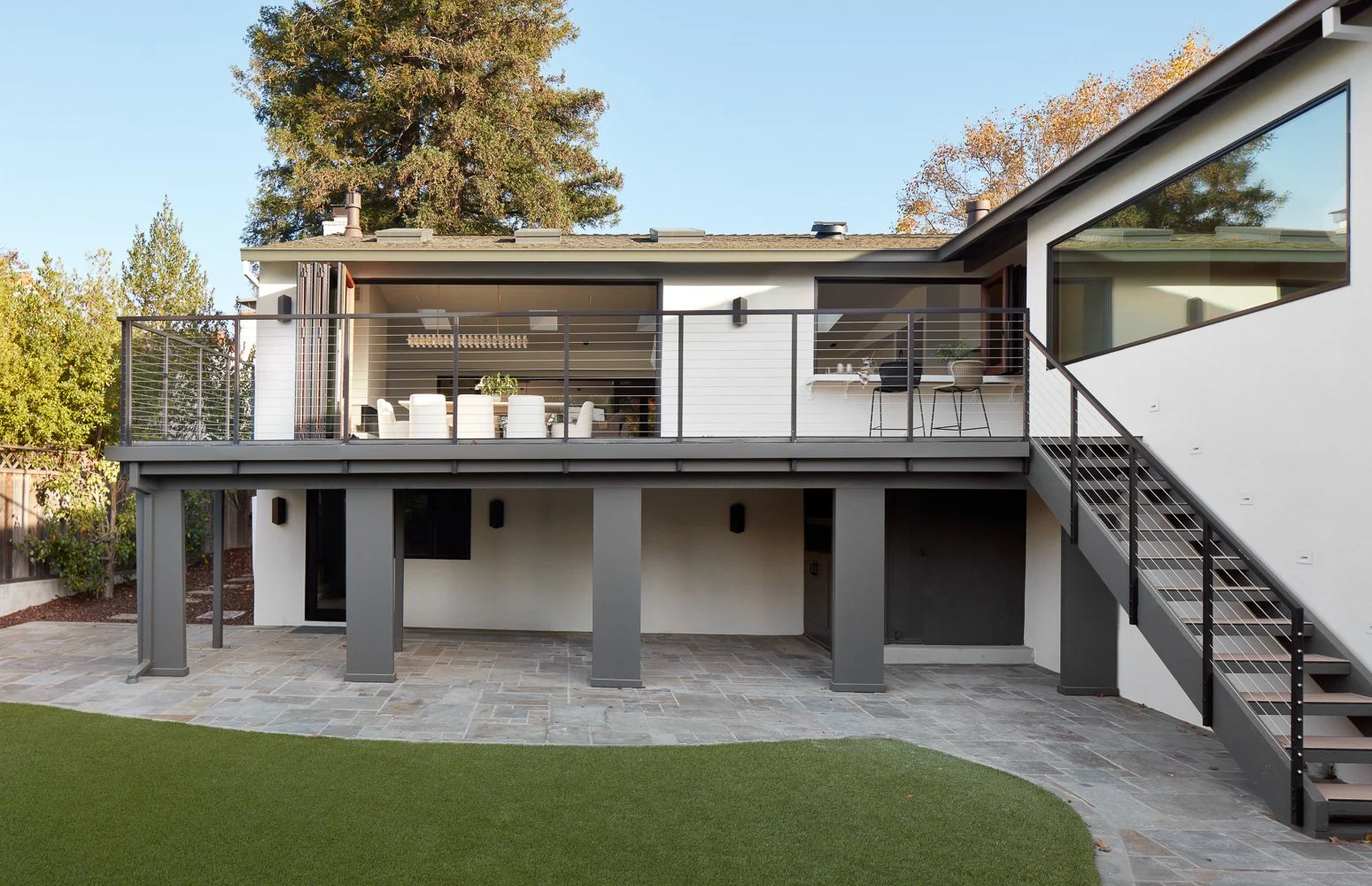 Rear exterior of a custom whole house remodel featuring an elevated deck with metal railing, outdoor dining area, and modern stair access to the backyard.